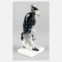 Firma Karl Ens, grüne Stempelmarke 1900–1932, naturalistische Ausformung, polychrome Auf- und Unterglasurbemalung, auf rechteckiger Plinthe Darstellung des Mephisto mit Kappe, sich mit einem Fuß abstützend, die Arme unter dem Mantel verbergend, H 24 cm.