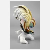 Firma Karl Ens, blaue Mühlenmarke 1919–1972, Modellnummer 7420, Stempelnummer 19, naturalistische Ausformung und polychrome Unterglasurstaffage, balzender Vogel mit gespreiztem Gefieder, auf Astsockel, eine Schwanzfeder bestoßen, H 28 cm.
