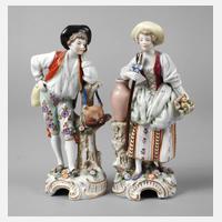 wohl Wallendorf, Anfang 20. Jh., imitierte unterglasurblaue Ludwigsburger CC-Marke mit Krone, polychrome Aufglasurbemalung und Goldstaffage, Dame mit Stock und Krug sowie Herr mit Tasche, als Pendants jeweils auf Rocaillensockel mit Baumstütze und Blumenzier, H je 17 cm.