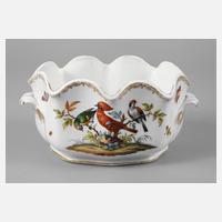 unglasierter Boden mit imitierter Augustus-Rex-Marke 1843–1883, ovaler, passig geschweifter Korpus mit rocaillenartigen Handhaben, beidseitig Vogelmalerei auf Stamm und Terrasse, mit jeweils drei versch. Vögeln und Insekten in polychromer Aufglasurmalerei, Goldstaffage und Goldspitzenbordüre, Vergoldung berieben, L 28 cm.