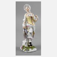 Entwurf Peter Reinicke um 1747, Ausformung zwischen 1747 bis etwa 1760, auf der Rückseite blasse unterglasurblaue Schwertermarke, dreifach gebranntes und glasiertes Hartporzellan mit polychromer Aufglasurmalerei und Goldstaffage, Bauersfrau mit Haube auf blütenbedecktem Postament mit Baumstumpf, das rechte Bein zum Tanz erhoben, in der rechten Hand den Rock haltend, als Pendant zum musizierenden Bauern mit Drehleier, sehr seltene und frühe Meissenfigur in sehr guter Erhaltung, lediglich eine Blattspitze am Sockel bestoßen, sonst absolut makellos und unrestauriert, H 20 cm, Quelle: Auskunft der Staatl. Porzellanmanufaktur Meissen, Staatl. Kunstsammlungen Dresden, Inventarnummer PE 173 (Bäuerin) und PE 258 (Bauer).Künstlerinfo: dt. Modelleur (1711 in Danzig bis 1768 in Meißen), ab 1743 Mitarbeiter J. J. Kaendlers an der Manufaktur, ab 1748 als selbständiger Modelleur beschäftigt und seit 1765 Restaurator alter Modelle, schuf zahlreiche Kleinfiguren und war an vielen Arbeiten Kaendlers beteiligt, Quelle: Hirmer, Meissner Porzellan, S. 34.