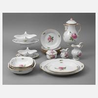 unterglasurblaue Schwertermarken 1924 bis 1980er Jahre, 1. und 2. Wahl, Präge- und Pinselnummern, Form ”Neuer Ausschnitt”, Dekor ”Rote Rose” in polychromer Aufglasurmalerei, Goldstaffage und Goldränder, bestehend aus Kernstück, einem Gießer, sechs Kuchentellern, zwei Saucieren, drei quadratischen Schüsseln und zwei Vorlegeplatten, Rosenknauf der Kanne restauriert, eine Schüssel am Standring mit kleinem Chip, H Kanne 26 cm.