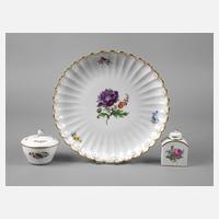 unterglasurblaue Schwertermarken, Präge- und Pinselnummern, polychrome Aufglasurbemalung und Goldränder, bestehend aus Kuchenschale Pfeifferzeit 1924–1934, Muschelrand und Dekor ”Blume 2”, Teedose mit Jahreszeichen 1983, Dekor ”Rose mit Vergissmeinnicht” sowie reliefierte Zuckerdose mit Jahreszeichen 1992, Dekor ”Chinesischer Schmetterling”, Schale mit min. Gebrauchsspuren, D Schale 27,5 cm.