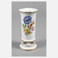 unterglasurblaue Schwertermarke, zwei Schleifstriche, Jahreszeichen 1974, Modellnummer 480, zylindrischer, konkav geschweifter Korpus mit Blumenbukett und Streublümchen in polychromer Aufglasurmalerei, unterglasurblaue Randborten, Goldrand, Standring minimal gechipt, H 25,5 cm.