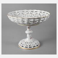 unterglasurblaue Knaufschwertermarke 1860–1924, 1. Wahl, Ritznummer 2, zweiteilig verschraubt, floral durchbrochen gearbeitete Wandung, Dekor ”Gestreute Blümchen” in polychromer Aufglasurmalerei, Goldränder, Schalenwandung restauriert, H 22 cm.