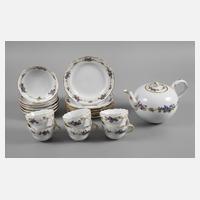 unterglasurblaue Knaufschwerter 1860–1924 und Pfeifferzeit 1924–1934, 1. Wahl, Form ”Neuer Ausschnitt”, bestehend aus Teekanne und sechs Gedecken mit umlaufender Veilchenranke in Aufglasurbemalung, Goldstaffage, Teekanne mehrfach in Deckelnähe sowie zwei Tassen min. bestoßen, L Kanne 25 cm.