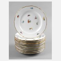 unterglasurblaue Knaufschwerter 1818–1924, 1. Wahl bzw. einmal vier Schleifstriche, versch. Präge- und Pinselnummern, Form ”Neuer Ausschnitt”, polychrome Aufglasurbemalung, Goldrand, D 24,5 bis 25,5 cm.