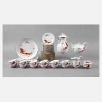 für zwölf Personen, unterglasurblaue Schwertermarke, zwei Schleifstriche, Jahreszeichen 1955, Dekornummer 1178h, Präge- und Pinselnummer, Form ”Neuer Ausschnitt”, korallrote Camaieumalerei, Goldstaffage und Goldrand, bestehend aus Kernstück mit Kaffee- und Teekanne, zwölf Gedecken und zwei Kuchenplatten, Rosenknäufe und Mündung der Kaffeekanne unbedeutend bestoßen, H Kaffeekanne ca. 26 cm.