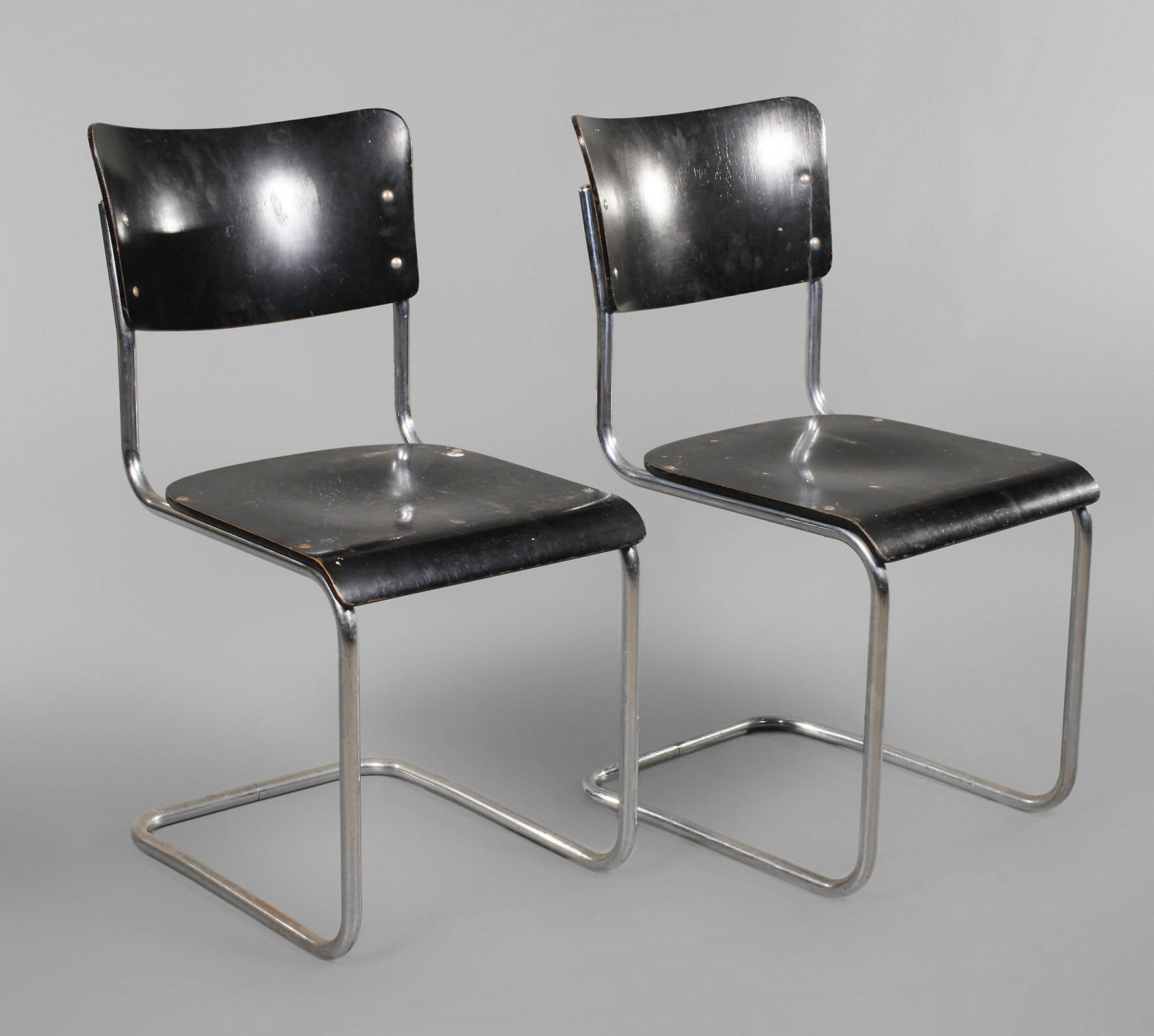 Entwurf 1939, Ausführung Mauser-Waldeck, zweiteiliges Gestell aus verchromtem Stahlrohr, Sitzfläche und Lehne aus schwarz gebeiztem Schichtholz, Lehne rückseitig mit Firmenlogo, Chrom Z 2-, guter unrestaurierter Originalzustand, H 83, SH 46 cm.