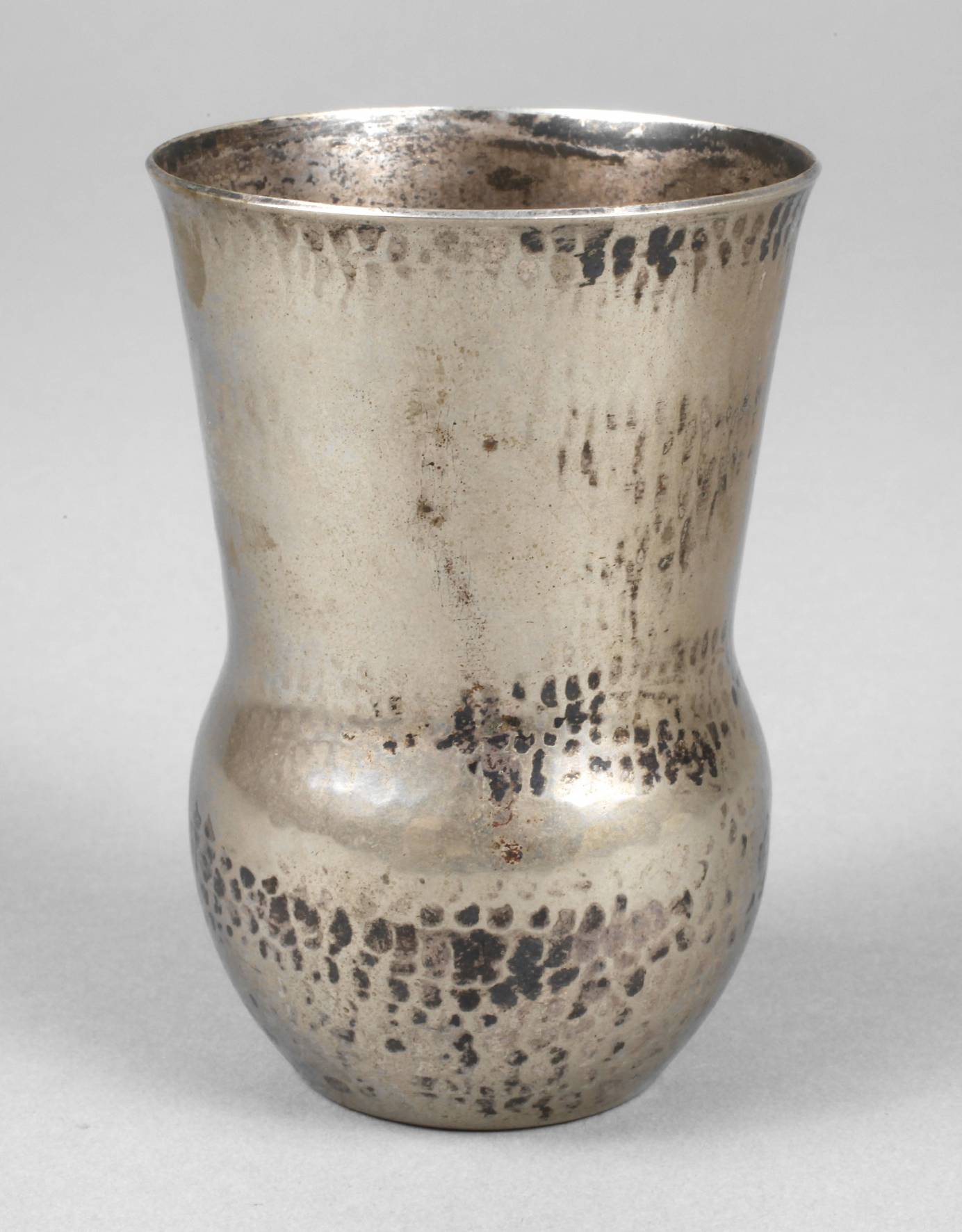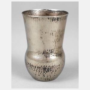 um 1922 bis 1925, am Boden geprägte Künstlersignatur CD ligiert, martellierter Becher aus Metall versilbert, kugeliger Korpus mit langem konischen Hals und leicht ausschwingender Mündung, normale Altersspuren, H 8,5 cm. Quelle: Die Metallwerkstatt am Bauhaus, Bauhaus Archiv 1992, S. 329, dort Abb. des Monogramms. Künstlerinfo: (1893 Offenbach bis 1974 Wiesbaden), 1907–11 Silberschmiedlehre, 1912/13 Schüler von van de Velde, 1921 Gründung einer eigenen Werkstatt, 1922–25 Werkmeister der Metallwerkstatt am Bauhaus Weimar, 1926–33 Leitung der Metallwerkstatt der Frankfurter Kunstschule, dort hauptsächlich mit Lampenentwürfen beschäftigt, 1939 Eröffnung eines Juweliergeschäfts in Wiesbaden.