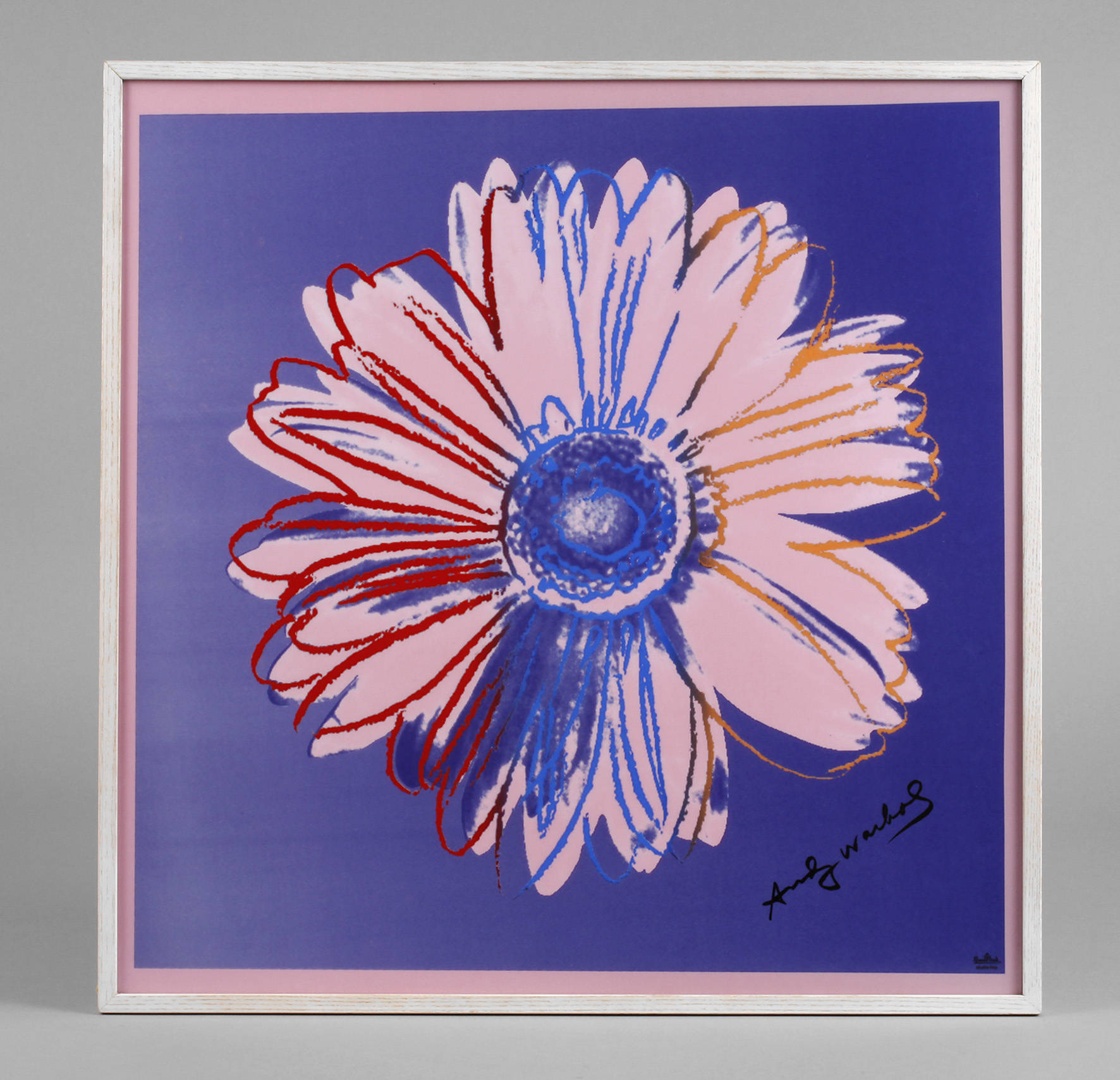 Entwurf Andy Warhol Warhol 1982, Ausführung Rosenthal nach 2002, gemarkt und signiert, verso orig. Klebeetikett Andy Warhol Collection Rosenthal studio-line, limited edition 08/49, The Andy Warhol Foundation for the visual Arts INC. New York, Farbserigraphie, orig. in Holzleiste gerahmt, IM 49 x 49 cm.