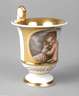 Alt-Haldensleben, unterglasurblaue Strichmarke 1826-1851, glockenförmiger Korpus mit hochgezogenem Volutenhenkel, dieser in reliefiertem Löwenkopf bzw. Palmette endend, schauseitig Rechteckkartusche mit Goldradierung, im runden Bildausschnitt feine polychrome Aufglasurbemalung, Darstellung eines ein Schaf umarmenden Puttos, umgeben von Wolken, Goldstaffage, innen Teilvergoldung, Goldränder leicht berieben, H 11 cm.