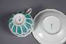 unterglasurblaue Schwertermarke mit grünem Beizeichen I: 1817–1823, Pinselnummer 20, Relieftasse mit umlaufendem gotisierenden Spitzbogenmotiv, türkisfarbener Bemalung und Vergoldung, komplett mit Untertasse, Vergoldung stark berieben, am Henkelansatz größerer Sprung und kleiner Ausbruch am Lippenrand, H gesamt 7,5 cm.