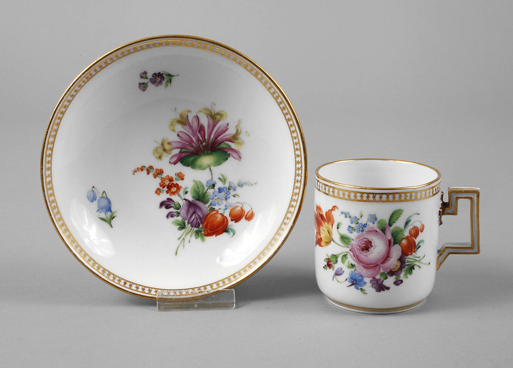 unterglasurblaue Knaufschwertermarke 1818–1860, undeutliches Formerzeichen und Pinselnummer 12, zylinderförmige Tasse mit kantigem Henkel, komplett mit gewölbter Untertasse, Dekor ”Blumenbukett” und Streublümchen in polychromer Aufglasurbemalung, Goldbordüre und Goldrand, Standring der Tasse brandrissig, H gesamt 7,5 cm.