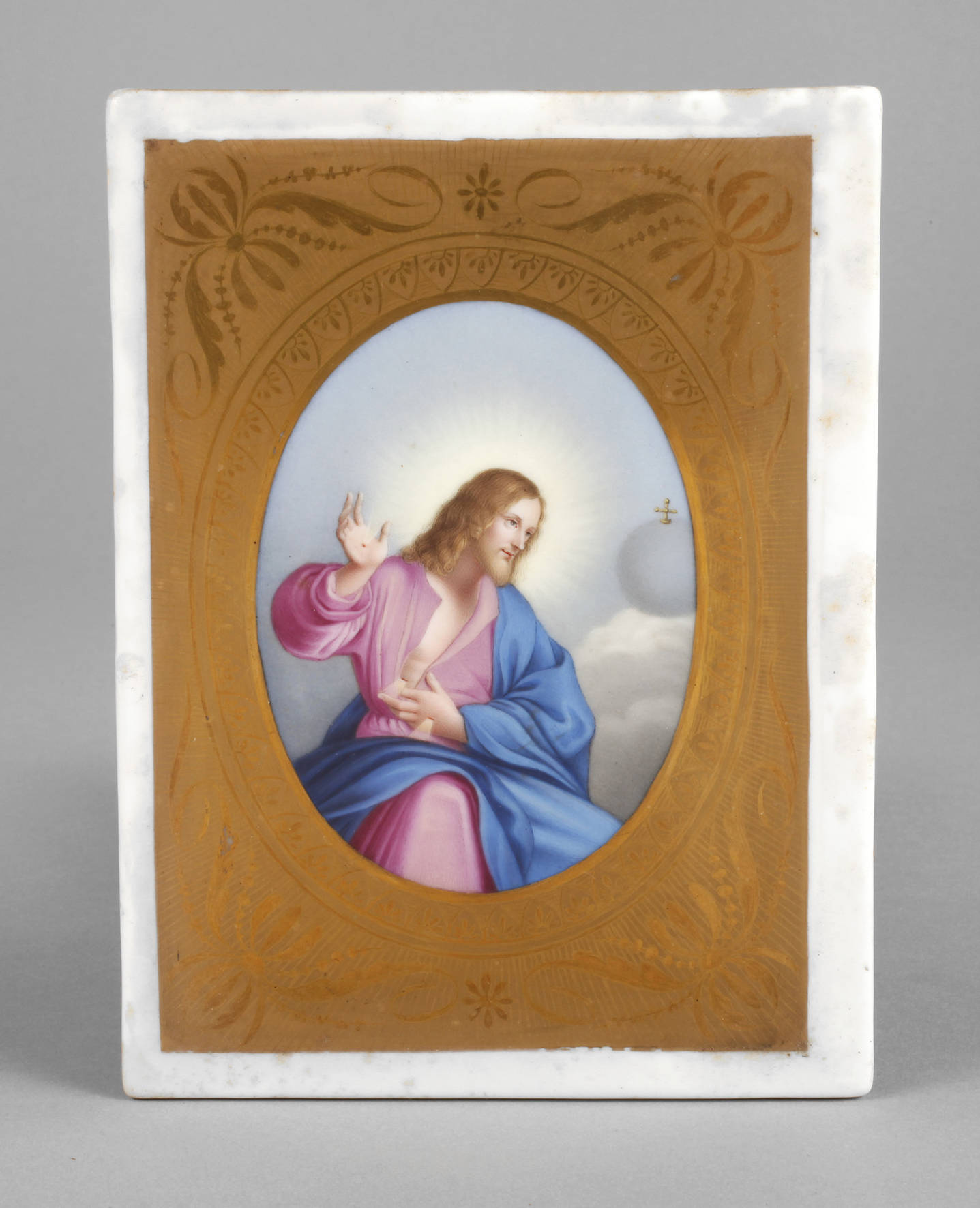 geprägte Zeptermarke mit Zusatz K.P.M. ab 1837, Jahreszeichen für 1914, flache hochrechteckige Bildplatte mit Darstellung Jesus Christus als Schmerzensmann mit sämtlichen Kreuzigungswunden und Nimbus in feiner Aufglasurmalerei, umgeben von breiter goldradierter Rechteckkartusche mit Ovalausschnitt, in breiter schwarzer Lackleiste der Zeit, verso Klebeetikett Kunsthandlung Otto Hundt Dessau, Vergoldung minimalst berieben, Rahmen leicht bestoßen, Maße Platte 15,2 x 11,5 cm.