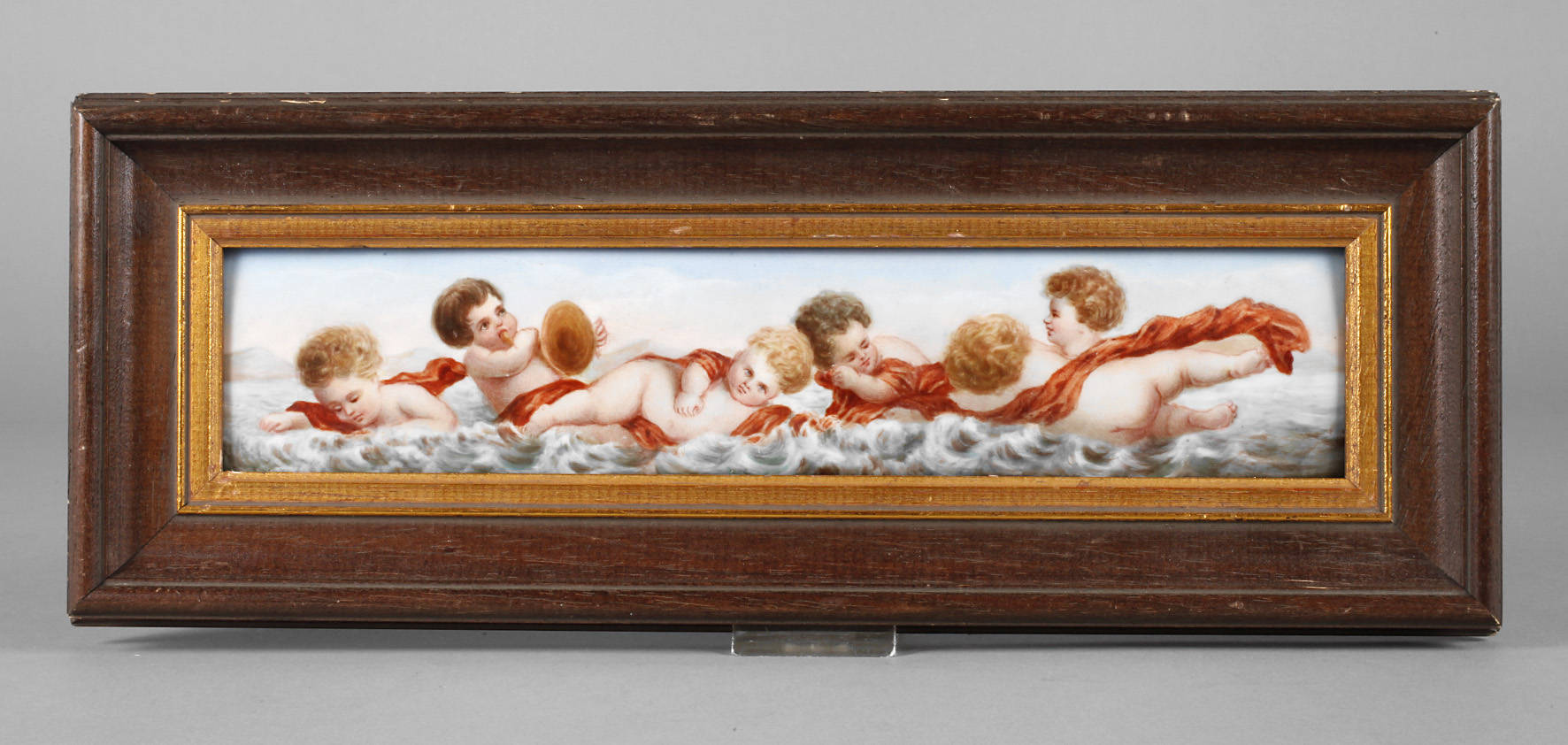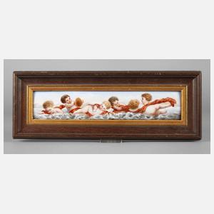 blaue Schwertermarke um 1722–1763, 1. Wahl, gewölbte rechteckige Platte mit feiner Aufglasurbemalung, barocke Engel mit Tüchern zwischen Wellen, im Hintergrund Landschaft mit Bergen, in späterer Leiste gerahmt, seitlich etwas bestoßen, Maße 29 x 7 cm.