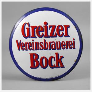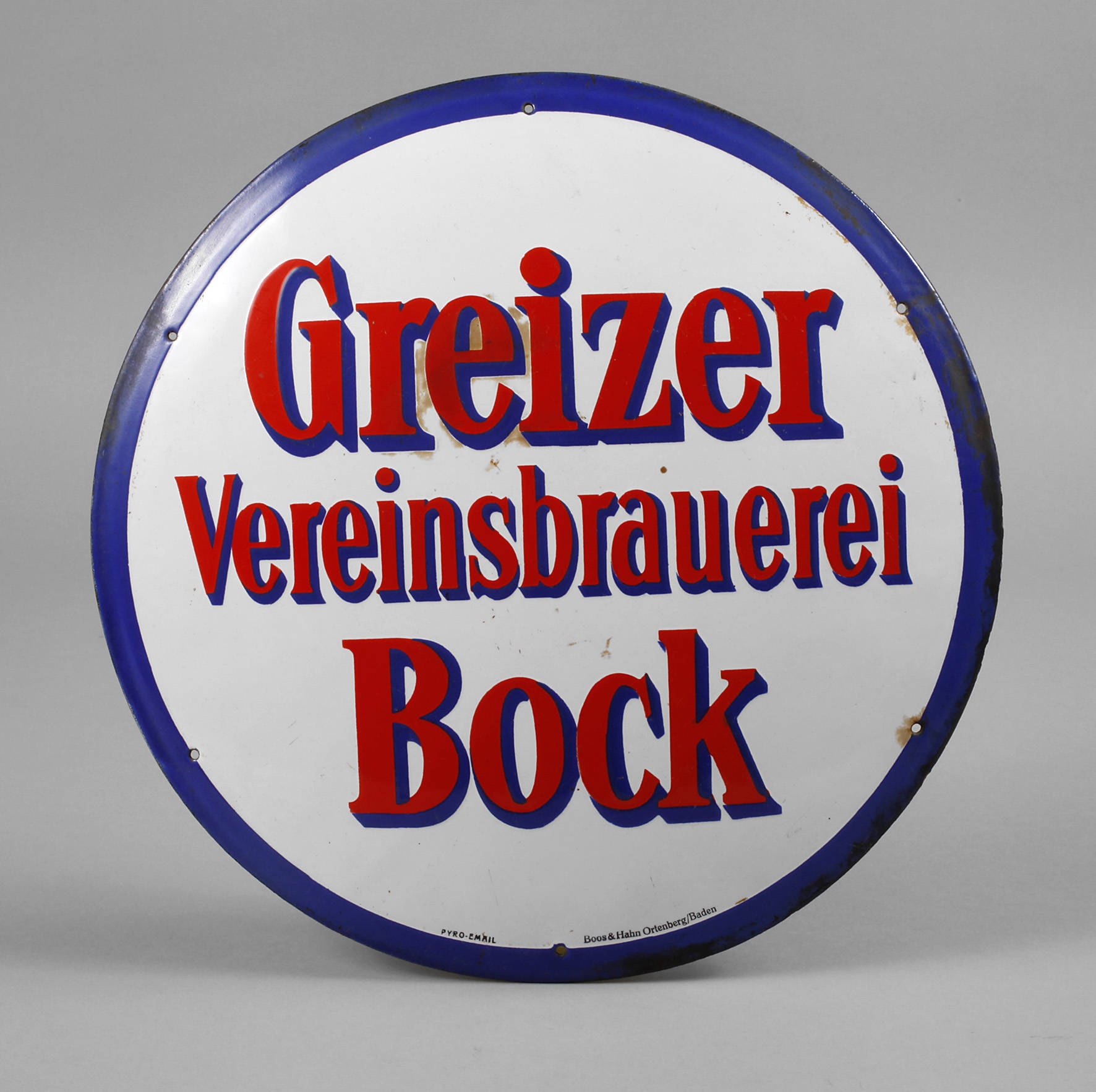 um 1920, gemarkt Pyro-Email, Hersteller Boos & Hahn Ortenberg/Baden, rundes, leicht gebauchtes Schild, dreifarbig emailliert, mit sechs originalen Bohrungen, rückseitig Herstelleretikett, minimale Altersspuren, Z 1, D 33 cm.