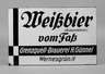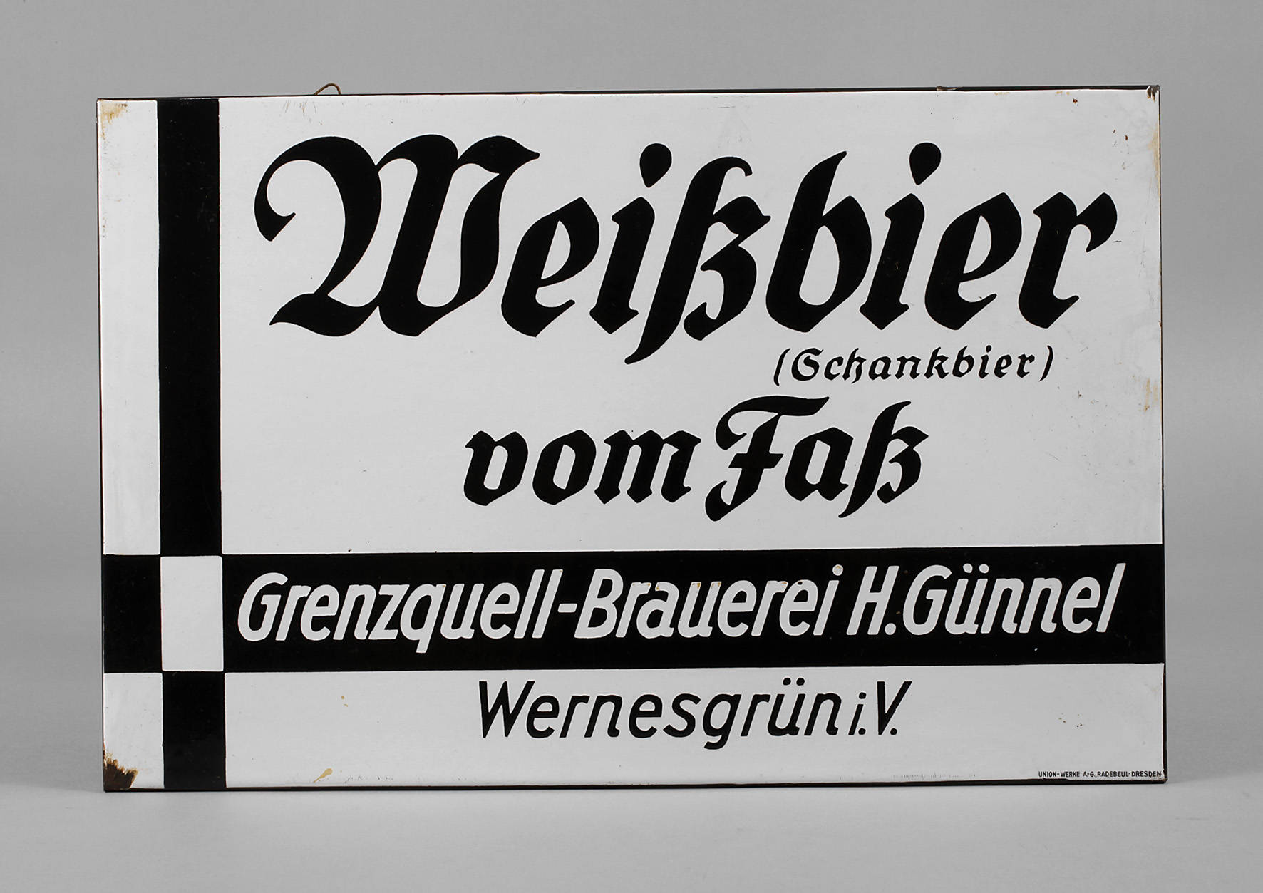 um 1920, Hersteller Union-Werke AG Radebeul-Dresden, flaches, langrechteckiges Schild, zweifarbig emailliert, für die Grenzquell-Brauerei H. Günnel Wernesgrün i.V., kleinste Emailfehlstellen im Randbereich, Z 1–2, Maße 32 x 49 cm.