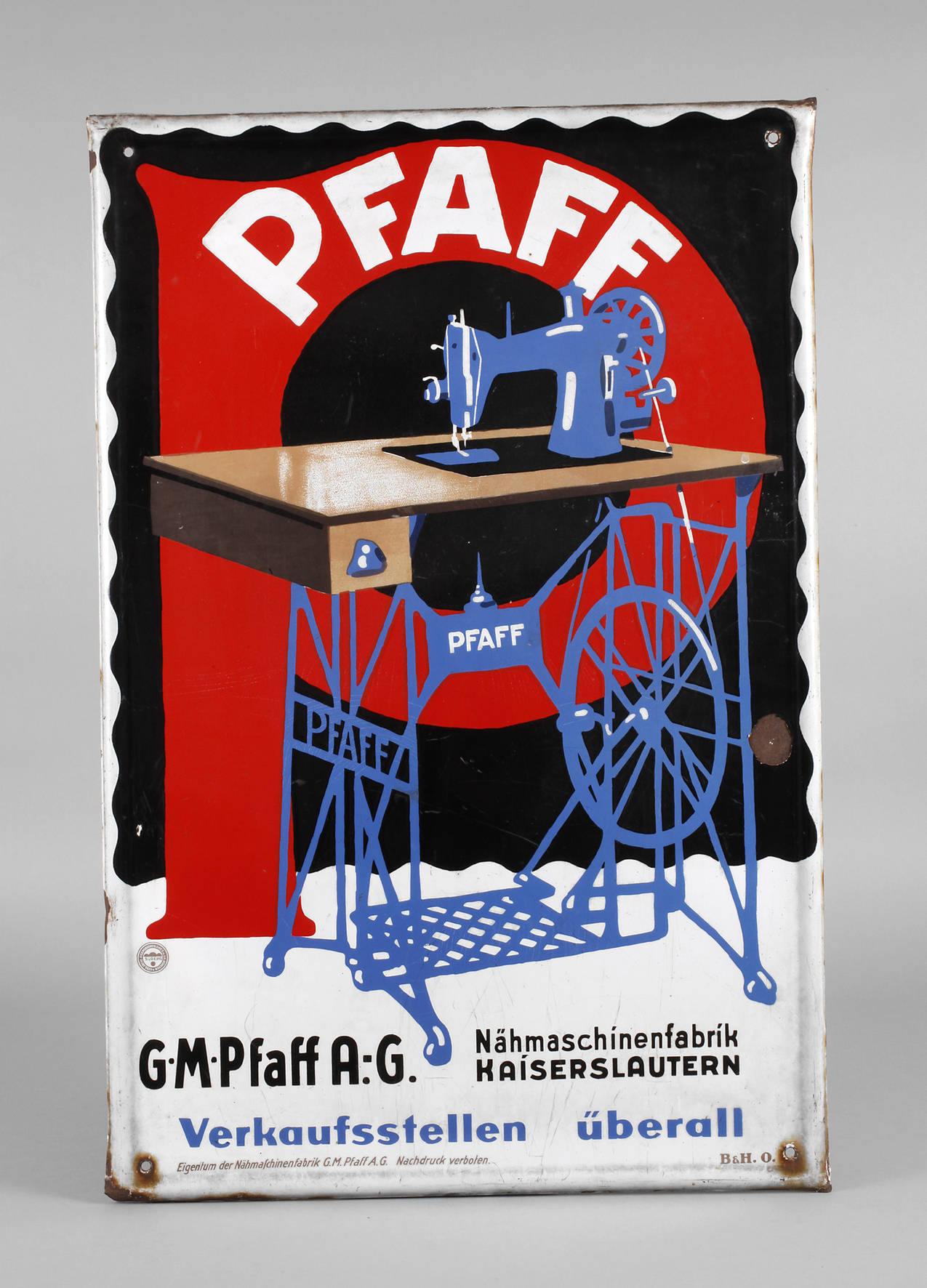 um 1910, gemarkt B & H. O., sowie Herstellermarke Südd-sächs.Eisenbahnreklame GmbH München, bezeichnet Eigentum der Nähmaschinenfabrik Pfaff AG, hochrechteckiges, flaches Schild mit gewulstetem Rand, mehrfarbig emailliert, vier originale Bohrungen, im Randbereich mit Emailverlusten, Z 2, Maße 89 x 58 cm.