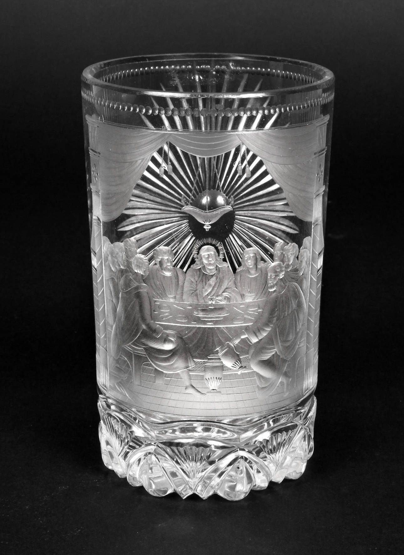 Gablonz/Nordböhmen, Mitte 19. Jh., seit Gustav E. Pazaurek werden Eduard Benda (1819-1901) und Anton Simm (1799-1873) aus dem Raum Gablonz als Hersteller genannt, obwohl niemand genau sagen kann, “was dort alles graviert wurde und welches die charakteristischen Merkmale dieser Schnittmotive sein könnten”, vermutlich als Kommunionsgeschenk, klares Glas, geschliffen, graviert, teilweise geblänkt, Zylinderform, qualitätsvoller Schliff mit feiner Darstellung von Augen und Händen, sparsame Blänkung einiger Details, an der Mündung kaum sichtbare winzigste Kerben, sonst tadelloser Zustand. H 15 cm. Quelle: Passauer Glasmuseum, Das böhmische Glas, Band 2, S. 116, Nr. II149, dort wird der abgebildete Abendmahlpokal auf Grund der sparsamen Blänkung dem Graveur August Böhm zugeschrieben.