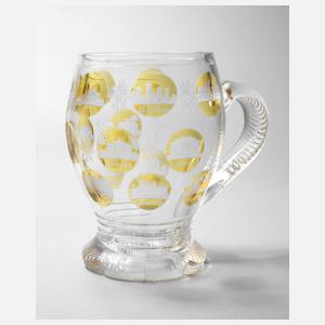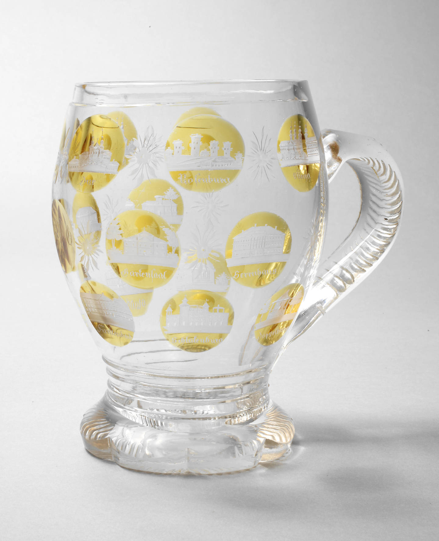 um 1900, farbloses Glas, ausgekugelter Abriss, Fuß und Henkel mit Kerbschliffdekor, 17 runde Kartuschen mit feinem Mattschliff und Gelbbeize, dazwischen Blütenmotive, Ansichten von Dux, Fürstenbad, Gartensaal, Schwefelbad usw., ohne Deckel gute Erhaltung, H 15 cm.