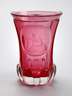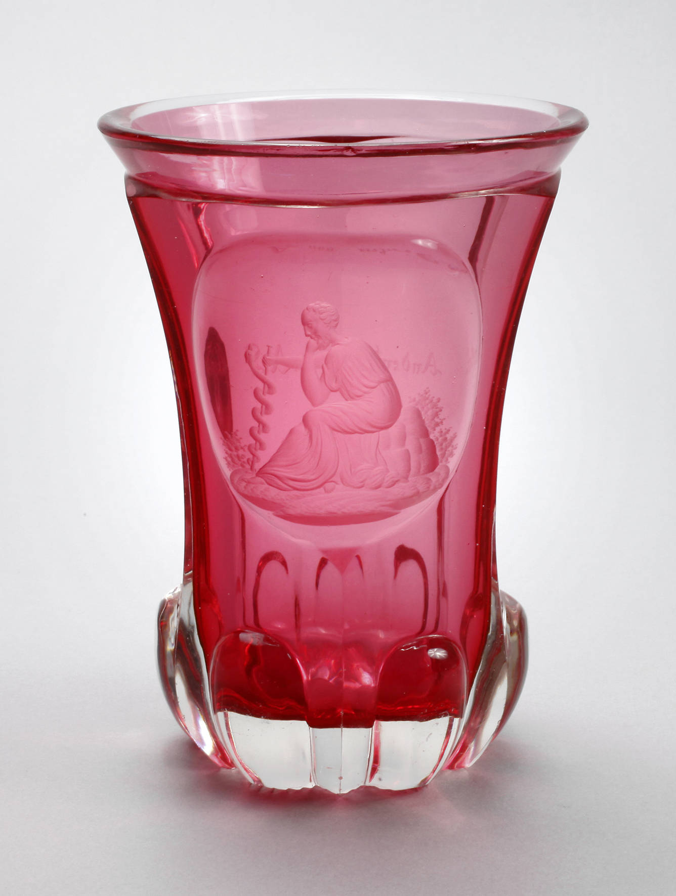 1. Hälfte 19. Jh., roséfarbenes Glas, ausgekugelter Abriss, facettiert, am Stand gebuckelt, der Boden mit Kerbschliff, schauseitig eine gewölbte Ovalkartusche mit feinem Mattschliff, Darstellung eines Gelehrten mit Äskulapstab, rückseitig: Andenken von A.S., am Lippenrand eine winzigste Kerbe, H 13,5 cm.
