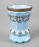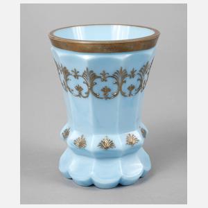 1. Hälfte 19. Jh., aus hellblauem, marmoriertem Milchglas, facettierter Becher mit ornamentaler Reliefgoldmalerei und vergoldetem Lippenrand, gute Erhaltung, H 12 cm.