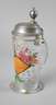Zinndeckel gepunzt Friedrich Traugott Günther/Freiberg, datiert 1840, Besitzermonogramm J.E.F.O., farbloses Glas, von innen und außen bemalt, mit buntem Emailfarben und Gold, Spruch: ”Nim dieses Glas von mier trink daraus das Kindtaufen Bier”, frei geformter und angesetzter Henkel, blasiger Abriss, Stand mit alter Restaurierung an einer Luftblase, H 25,5 cm.
