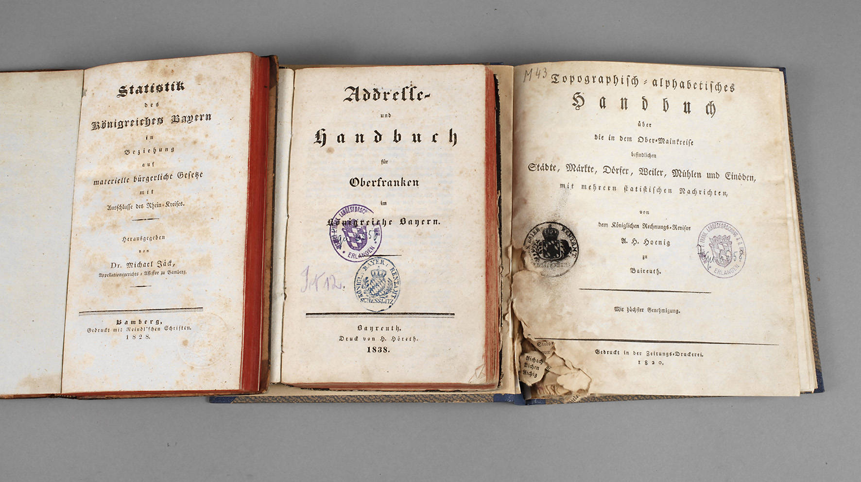 Adresse- und Handbuch für Oberfranken ..., Druck H. Höreth, Bayreuth 1838, Format 8°, 311 S., mit einer gefalteten Postboten-Übersicht, Rotschnitt, im Pappeinband der Zeit (Rücken lädiert), dazu Statistik des Königreiches Bayern in Beziehung auf materielle bürgerliche Gesetze mit Ausschlusse des Rhein-Kreises, hrsg. von Michael Jäck, Bamberg 1828, sowie Topographisch-alphabetisches Handbuch über die in dem Ober-Mainkreise befindlichen Städte, Märkte, Dörfer, Weiler, Mühlen und Einöden ..., von A. H. Hoenig, Zeitungs-Druckerei 1820 (Einband jüngerer Zeit, Falz bei Unterkante lädiert und mit Textverlust), alle mit Bibliotheksvermerken.