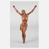 19. Jh., wohl Buchsbaum beschnitzt und bräunlich gebeizt, Christus im Typus der Dreinagelung, Armansätze sichtbar, rückseitig originale Bohrung, H 38 cm.