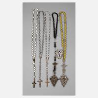 19./20. Jh., zehn Rosenkränze aus verschiedenen Materialien, mit Perlbesatz, aus Bein, Holz und Glas, drei Etuis in Buchform, acht Kreuzanhänger bzw. Kruzifixe sowie ca. 17 Aluminiumplaketten, unterschiedliche Maße und Erhaltungen, L max. 45 cm.