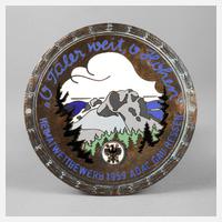 datiert 1959, bezeichnet ”O Täler weit, o Höhen”, anlässlich des Heimatwettbewerbs ADAC Gau Hessen, Bronze versilbert und mit polychromem Zellenschmelzemail verziert, zwei originale Bohrungen, leichte Altersspuren, D 10,5 cm.