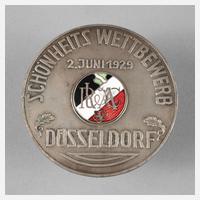 datiert 2. Juni 1929, rückseitig Herstellermarke Fahnenrichter Köln, anlässlich des „Schönheits Wettbewerb Düsseldorf“, Metallguss, mittig mit emailliertem Emblem, monogrammiert RL & AC, D 5,5 cm.