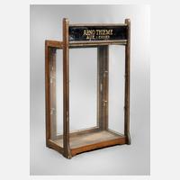 um 1910, Arno Thieme Aue i. Erzgebirge, schwarzes Glasschild mit Goldschrift, Vitrine aus Eiche, vierseitig verglast, mit Metallbändern verziert, rückseitig zu Öffnen, Einlegeböden fehlen, Z 3, Maße 75 x 45 x 25 cm.