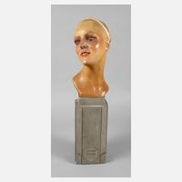 um 1915, Büste und Sockel gemarkt Ateliers d'Art Robert Sauleau Paris sowie Fabrique par Lucifer Paris, Modellnummer 1290 83 34, Wachsguss farbig gefasst, mit eingesetzten Glasaugen und Glaszähnen, Reste alten Echthaarbesatzes, dazu Sockel aus Kunstguss in Marmoroptik, partiell retuschiert, rest.bed., H ges. 67 cm.
