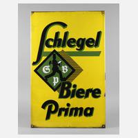 1930er Jahre, Schlegel Biere Prima, Hersteller Union Werke AG Radebeul, abgekantetes Schild, zwei kleine Randschäden, sonst guter Zustand, Maße 97 x 63 cm.