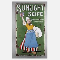 um 1900, Sunlicht Seife sondergleichen für die Wäsche, farbig emailliertes, extrem seltenes Schild, Darstellung eines Holländermädchens mit Wäschekorb, ohne Hersteller, Z 3, 183 x 106 cm.