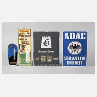 Mitte 20. Jh., vier Teile, dabei Innenthermometer aus Glas von Nordstern Versicherungen, Hersteller Glasplakate Offenburg, Fritz Borsi KG, weiteres Innenthermometer Horstkötter KG, Maschinenfabrik Bekum, Hersteller Imoglanz, Plakate Fabrik Carl Vollmer Wuppertal, dazu Blechschild ADAC Straßendienst, ohne Hersteller, sowie Wandkalender mit Drehfunktion der Gothaer Feuer Versicherungsbank AG, ohne Hersteller, alle funktionstüchtig, Alters- und Gebrauchsspuren, L max. 29 cm.