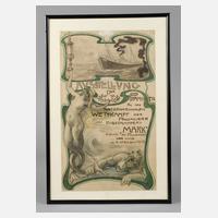 Entwurf um 1902, Mischtechnik auf Papier, anlässlich der Ausstellung der Prämien für den internationalen Wettkampf der Passagiere des Rollstampfers Mark, anlässlich des Passierens der Linie am 15. April anno 1902, zwei kleinere, retuschierte Fehlstellen, hinter Glas gefasst, Blattmaß 39 x 23,5 cm.