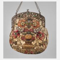 um 1920, floral geprägte Silbermontierung gemarkt Halbmond, Krone und 800 sowie Hersteller Hestermann und Ernst, besetzt mit mehrfarbigen Glas- bzw. Perlmuttcabochons, an kurzer Gliederkette, floral bestickte Beuteltasche, innen mit grünem Samt ausgeschlagen, Altersspuren, Maße 25 x 23 cm.