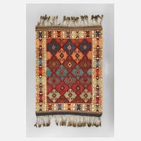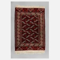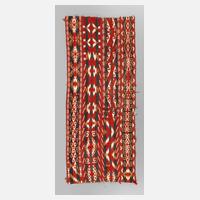 2. Hälfte 20. Jh., heller geometrischer Dekor über dunkelrotem Fond, mehrteilige umlaufende Bordüren, Fransenbesatz einer Schmalseite gekürzt, ein kleines Loch, Maße 126 x 86 cm.