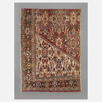 Mitte 20. Jh., in rostrotem Kolorit mit cremefarbenem, rapportierendem Dekor, mehrteilige Randbordüren, stärkere Erhaltungsmängel, Maße 194 x 120 cm.