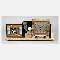 Frankreich, 1930er Jahre, geometrisch verziertes Gehäuse aus mehrfarbigem Marmor und Onyx, schauseitig eingelassene Metallplatte mit figürlicher Darstellung, signiert ”Nino”, versilbertes quadratisches Ziffernblatt mit arabischen Ziffern, Werk mit Ankerhemmung, Schutzglas an einer Ecke gesprungen, funktionstüchtig, H 26 x B 55 x T 11 cm.