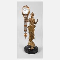 deutsch, um 1900, auf emailliertem Ziffernblatt gemarkt Junghans Estrella, farbig gefasste Figur aus Metallguss auf ebonisiertem Holzsockel montiert, Ziffernblatt mit Chip bei der ”8”, Figur mit partiellen Farbverlusten, Werk läuft an, H 34 cm.