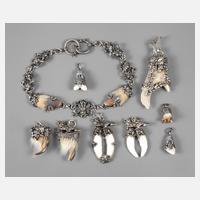 2. Hälfte 20. Jh., Silber gestempelt 835, Uhrenkette aus jagdlichen Schmuckgliedern, besetzt mit Rehklauen, L ca. 33 cm, sowie acht Anhängern, besetzt mit Grandeln, Hauern, Geweihstücken, Klauen, G gesamt ca. 168,2 g.