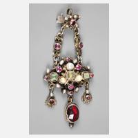 2. Hälfte 19. Jh., Silber geprüft, beweglich gearbeitet, besetzt mit zahlreichen Smaragden, Granaten und Perlen, Tragespuren, L ca. 70 mm, G ca. 13 g.
