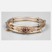 Ende 19. Jh., Metall vergoldet, Punze St & L, in Form eines gewundenen Stabes mit Kugelenden, schauseitig besetzt mit fünf facettierten Granaten, verdecktes Steckschloss und Sicherheitskettchen, Tragespuren, alt repariert, D max. 54 mm.