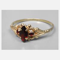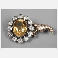 2. Hälfte 19. Jh., Gelbgold geprüft 585/1000 und Silber, in Form eines stilisierten Füllhorns, besetzt mit oval facettiertem Citrin in Zargenfassung, umgeben von Kranz aus facettierten Bergkristallen, leichte Tragespuren, Maße ca. 30 x 20 mm.