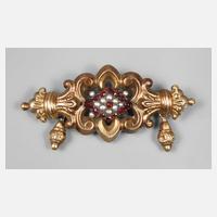 um 1860, Schaumgold, plastisch gearbeitete Rocaillen, mittig besetzt mit facettierten Granaten und Saatperlen, im unteren Bereich zwei Abhänger (mittlerer fehlt), leichte Tragespuren, Maße ca. 28 x 49 mm.