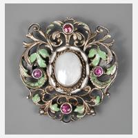 um 1860, Silber geprüft, mittig besetzt mit Perlmuttcabochon in Zargenfassung, umgeben von durchbrochen gearbeitetem, partiell emailliertem Rankenwerk, besetzt mit drei Granaten und einem synthetischen Rubin, leichte Altersspuren, Maße ca. 34 x 31 mm, G ca. 7,5 g.